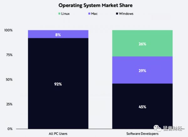 几份报告表明,苹果将在2021年发布基于ARM的MacBook。有趣且重要的是,尽管其在PC领域的市场份额仅为8%,但苹果在全球软件开发商中的份额却增长了四倍,达到29%,如下图所示。因此,苹果转向ARM可能会吸引一个庞大且极具影响力的开发者群体。如果笔记本电脑运行ARM,开发人员可能会默认使用云中的ARM。