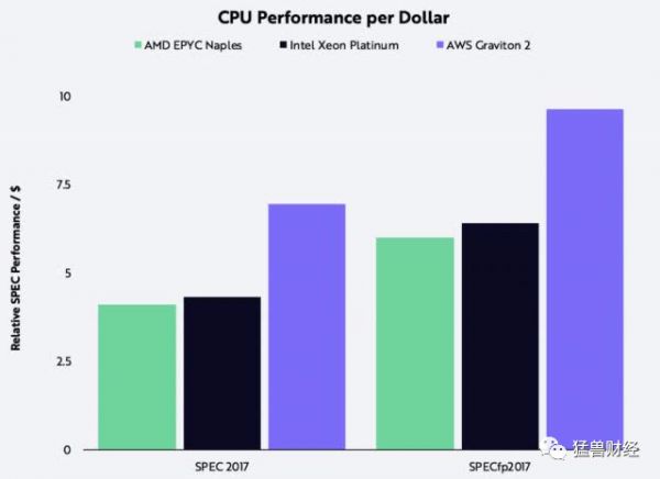 基于台积电的7nm制程,亚马逊的Graviton2 ARM CPU于2020年5月正式上市。媒体发现它提供的价格性能几乎是英特尔和AMDx86cpu的两倍,如下图所示。