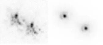 对距离地球181光年外的一个Zeta Boötis双星系统进行幸运成像,拍摄到的单张照片是左面糟糕样子,但是很多张“臭皮匠“合成的”诸葛亮“确如右面这样清晰(图片来源:维基百科[1])