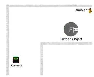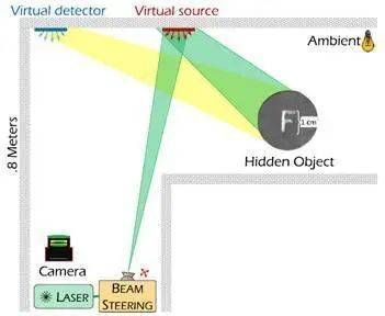 为了达到目标,有研究者脑洞大开,提出了这样一种方式,堪称大数定律的进阶应用。在相机旁边安装一个激光发射器,激光发射器把光束发射到墙上红色位置,然后反射光照到物体上,之后物体再把光束反射到墙上的蓝色位置,然后相机就可以拍摄下来了。