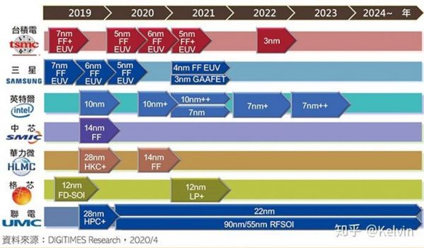 目前全球芯片厂商的芯片制程工艺和进度来看,台积电、三星、英特尔位于金字塔的顶端,国内公司如中芯、华力微、格芯等公司普遍在28nm、14nm和12nm的制程。