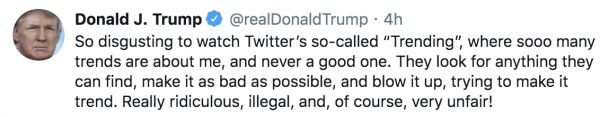 特朗普发布推文称,“所谓的热搜榜真是‘令人恶心’,很多都与我有关,但从来都不是好的热搜。他们(推特公司)会寻找能够找到的任何东西,然后把这件事变得糟糕,试图将它推上热搜。真的十分荒谬,这是违法的,并且对我来说非常不公平”。