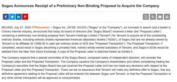 搜狗同时提醒公司股东,以及其他考虑买卖搜狗股票的投资者,搜狗董事会刚收到该建议函,并未就建议函及提议中的交易作出任何决定。不能保证腾讯将向搜狗提出任何最终要约,以及搜狗和腾讯之间将达成任何与建议书有关的最终协议,也不能保证提议的交易或任何其他类似交易将获得批准或完成。