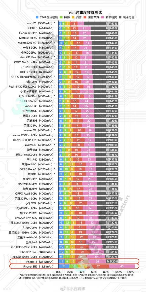 ——这是一个什么概念?自媒体“小白测评”长期跟踪手机五小时连续重度使用后的电池情况。事实上,连续重度使用的五小时,现有的手机基本都还剩下不少电量。当然,在实际场景中,除了使用的5~6个小时外,待机、信号也是要费电的,但与重度使用的消耗差得远。