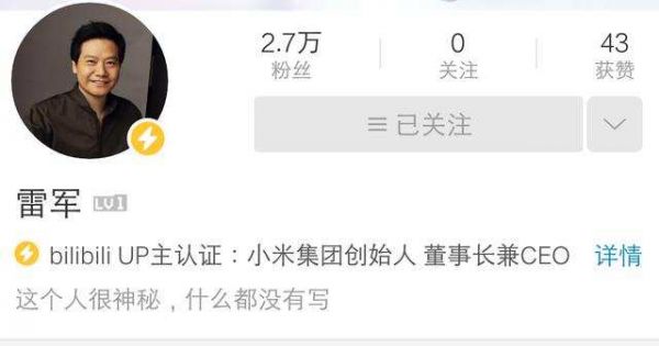 雷军的B站账号UID为646730844,不过目前并未发布任何内容。截至发稿雷军在B站的粉丝数量已经超过两万,但其未关注其他任何账号。