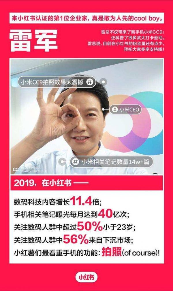2019年6月,在号称为"小仙女"设计的CC手机上线之际,小米创始人兼"宣传委员"雷军正式在"小红书"开辟了个人账号,做起了网红。入驻不到一周的时间,"新人"雷军发布了20条笔记,内容都以当时最新发布的CC手机为主。在小米新品手机CC9的发布会上,雷军还在现场为自己的小红书账号努力拉粉。