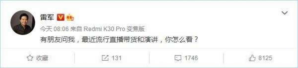 在入驻B站同时,7月28日早晨,雷军更新微博称,"有朋友问我,最近流行直播带货和演讲,你怎么看",似乎在暗示新品将通过带货直播的形式发布。