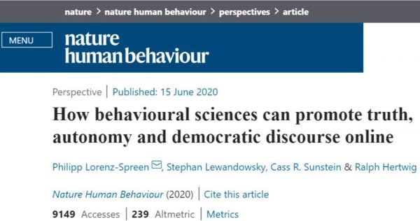 论文题目:How behavioural sciences can promote truth, autonomy and democratic discourse online,论文地址:https://www.nature.com/articles/s41562-020-0889-7