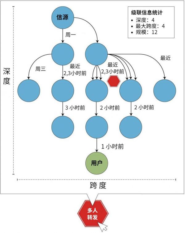 信息分享级联模型,为我们呈现出了完整的信息转发链条。用户可以看到一则信息从最早的信源发布开始所经历的时间与转发关系。网络用户可以自行根据信息发布、转发的时间以及转发链条上的用户账号信息,判断自己收到的信息价值多少。比如,一个用户如果从社交网络看到一则耸人听闻的信息,但同时也发现这则信息其实是几年前的“冷饭”。或许,这时读者就要留个心眼,想想为何这碗“陈年旧饭”又被翻炒出来。