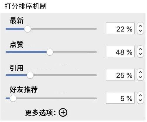 以此操作使得用户实际上参与了推送分发算法的设计过程,并且能够根据自己的偏好对相应的分数权重进行调配。这样做一方面提高了算法“可理解的透明度”,另一方面也让用户意识到自己参与到了网络社区信息的共建中。