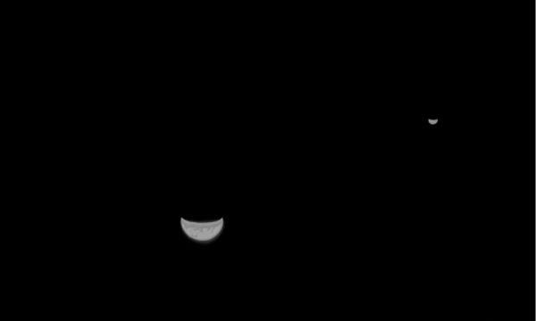 @环球网【天问一号探测器传回地月合影】我国首次火星探测任务天问一号探测器目前飞行状态良好,能源平衡、工况正常,探测器已脱离地球引力影响范围,进入行星际转移轨道,飞离地球超过150万公里。天问一号探测器在飞离地球约120万公里处回望地球,利用光学导航敏感器对地球、月球成像,获取了清晰地月合影。在这幅黑白合影图像中,地球与月球一大一小,均呈新月状,在茫茫宇宙中交相辉映。