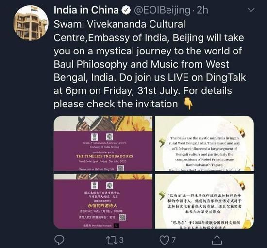 微信使用遇阻,似乎给其他即时通讯工具带来机遇。印度驻华大使馆也开始用其他即时通讯工具来做直播活动了。在7月28日下午发布的一条推文里,印使馆邀请观众通过钉钉来收看一场在线音乐演出。