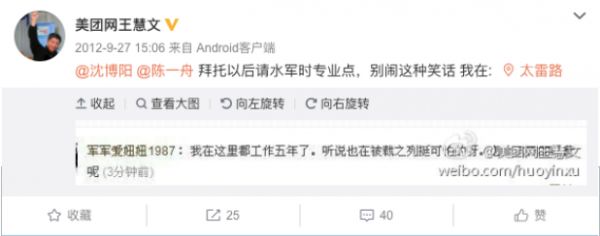 2012年9月,他在微博发了一张截图,因为人人网的公关向媒体发出一份稿件,标题是“团购波澜再起 美团全国大幅裁员”。随后他又@陈一舟,“拜托以后请水军时专业点”,微博配图是网友留言:我在这里工作都五年了,听说也在被裁之列。