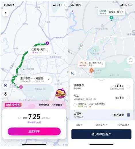 “商业人物”在手机上对两款打车app进行了测试,定位于“花小猪”最早进驻的城市贵州遵义,5公里左右的距离,花小猪要比滴滴便宜一点。