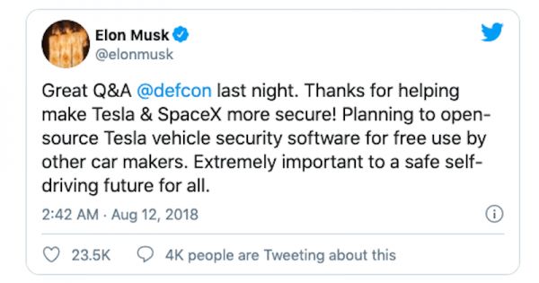 根据CNBC的消息,埃隆·马斯克曾于2018年在拉斯维加斯的一次黑客大会上表示,他计划“开源”(opening source)特斯拉用来从黑客或其他人手中保护自动驾驶功能的软件,并最终允许其他汽车制造商使用它。