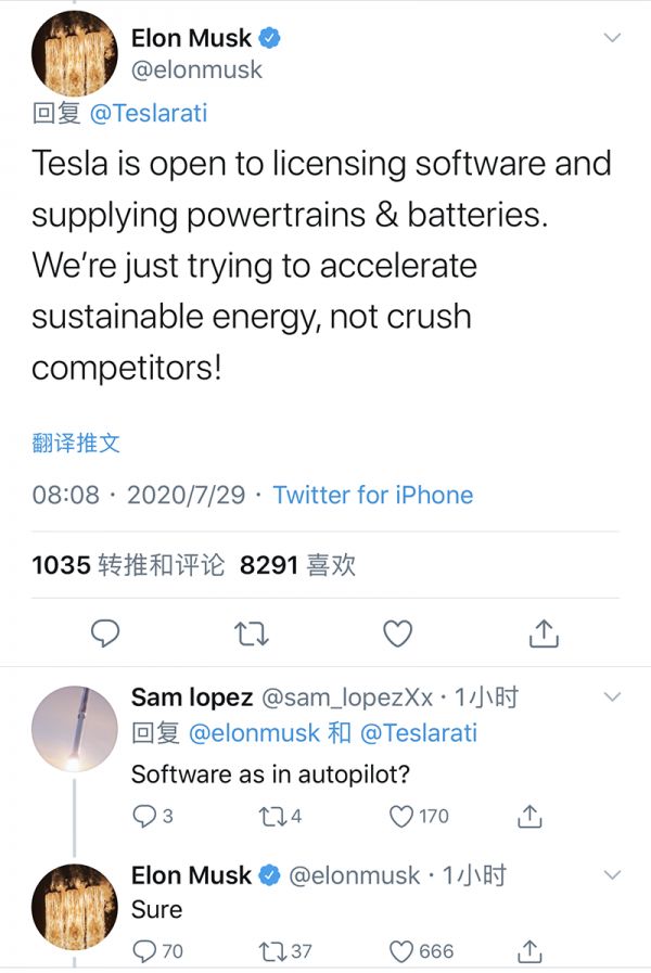 然后,特斯拉首席执行官埃隆·马斯克(Elon Musk)回复了TESLARATI的这条推特,马斯克写道:“特斯拉对于授权(licensing)软件以及提供动力系统和电池持开放态度。我们只想加速可持续能源发展,而不是压垮竞争对手!”