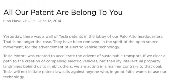 2014年,埃隆·马斯克在一篇博文中写道:出于开源运动的精神,也为了电动汽车技术的进步,它们(特斯拉专利墙)已经被移除了。同时,他表示,“特斯拉不会对任何出于善意使用特斯拉技术的人提起专利诉讼。”