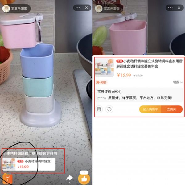 此外,与抖音、快手短视频内容不一样的另一点是,淘宝特价版看看频道的每一个短视频都对应一个产品,有购物袋功能,可以实现边看边买。