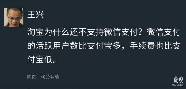 @虎嗅【王兴回应美团短暂取消支付宝支付】王兴:淘宝为什么还不支持微信支付?微信支付的活跃用户数比支付宝多,手续费也比支付宝低。