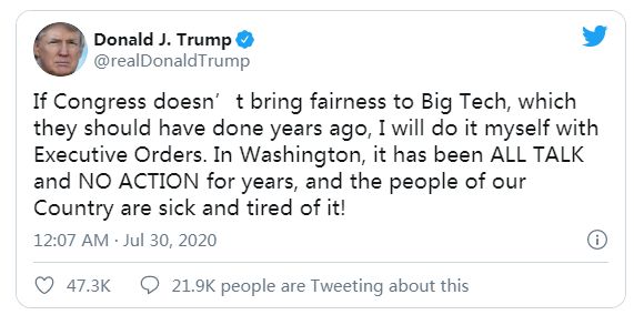 四大科技巨头不止要应对来自听证会的压力,特朗普发推表示会进一步施压: