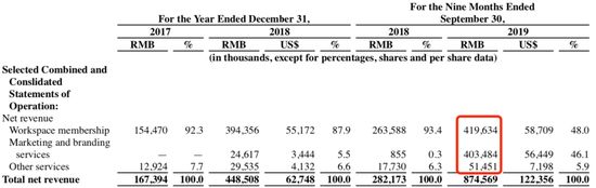 但会员费在总收入当中的占比在2017年、2018年分别能占到92%、88%,到2019年却突然腰斩至48%。与之对应的是,市场及品牌服务收入在2018年全年仅为2460万,2019年前三季度的收入就猛增到4.03亿。也就是说,在优客工场扭亏为盈的这一年,光是市场及品牌服务收入就占了半壁江山。