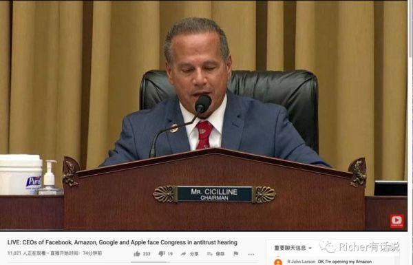 谷歌被质疑的也很多,我只提偷信息和Youtube这两点。一些议员攻讦Youtube的内容存在对Covid19信息不正当引导(比如Youtube上的视频讨论到底该不该戴口罩)。Yelp落井下石提供了Google利用平台能力偷窃其用户Review的事实,这确也无可辩驳。劈柴作为唯一一个外国人(印度裔)列席,明显有点紧张结巴。