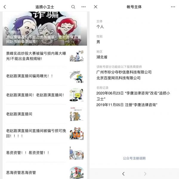 比如,当我们打开链接微信上追损的文章,可以看到的是很多在做追损服务的账号在以受害人和律师的身份控诉那个冒牌的锦鲤财经,最后还不忘附上他们的联系方式,美其名曰帮忙追损。