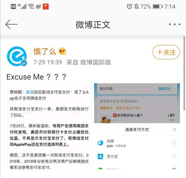 但没过多久,饿了么官博甩出两张图片力证自己可以使用微信支付。进而美团月付在晚上九点再次回应此事,顺便发出灵魂的质问:“淘宝啥时候能用微信支付、美团月付呢?”