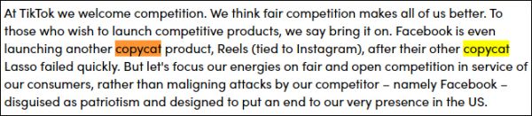 TikTok对竞争对手喊话:“放马过来(Bring it on)。”目前,Facebook正在一些国家推出名为Reels的新产品。梅耶尔直接点名这款产品和短视频应用Lasso是“山寨货”,并指出“他们的另一款抄袭产品Lasso很快就垮了。”