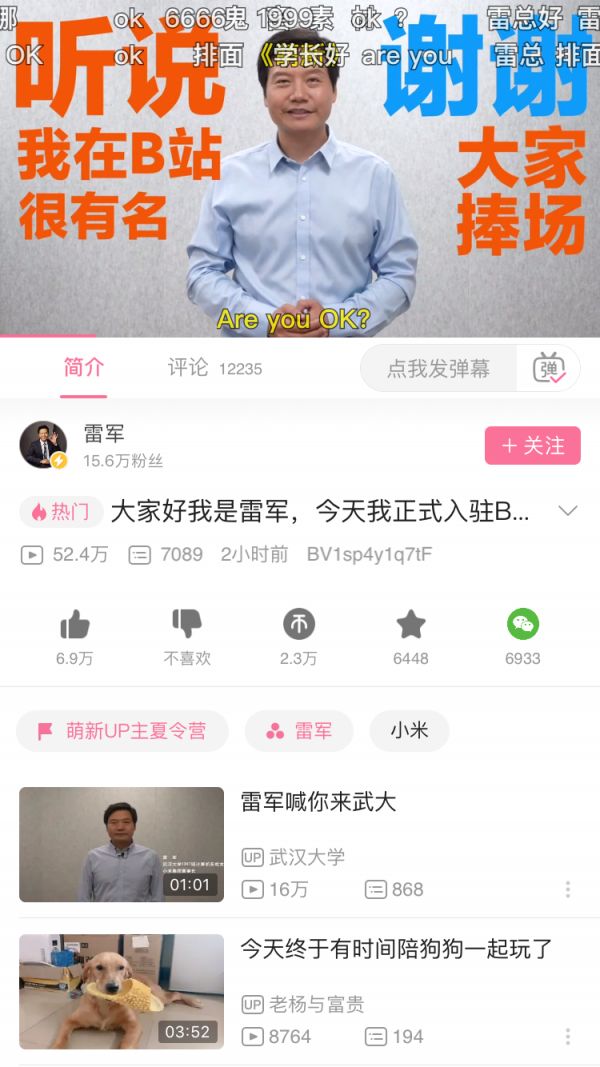 7月30日上午,小米集团创始人、董事长兼CEO雷军发布了在B站上的首条视频,正式宣布入驻B站。官宣之后不到2小时,雷军粉丝涨至15.6万,视频点击量超50万。