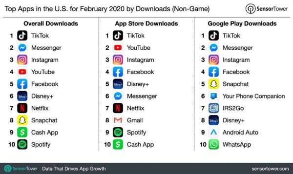 注:2020年2月,美国非游戏类APP下载量排行榜(来源:Sensor Tower)