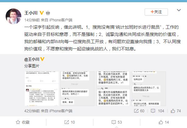 王小川微博发文:搜狗不姑息不认同公司价值观的人