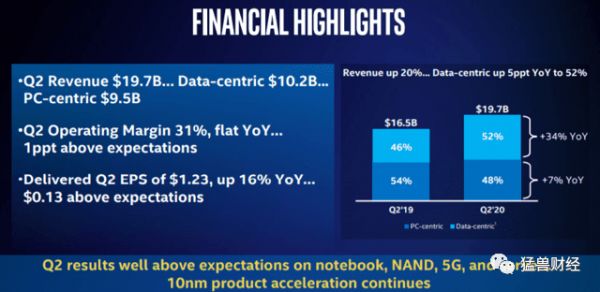 在一个充满挑战的商业环境中,英特尔的季度营收达到了197亿美元(同比增长20%),超过了预期。英特尔向以数据为中心的业务转型进展顺利,以数据为中心的营收同比增长34%(占营收组合的52%)就是明证。由于“宅在家”的需求上升,以PC为中心的业务增长了7%。