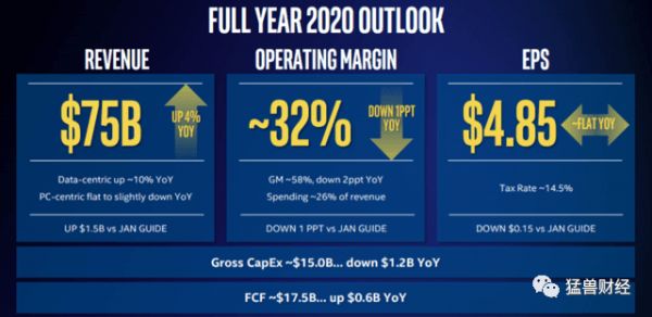 英特尔预计全年营收为750亿美元(同比增长4%),但营业利润率将下降1%。考虑到疫情的影响,投资者真的不能怪英特尔在2020年的表现。