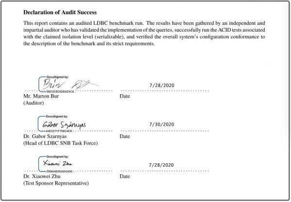 审计测试成功的声明页截图(含认证审计员,LDBC SNB任务组主任和费马科技CTO的签名)