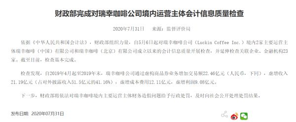 (原标题:财政部:自2019年4月起至2019年末 瑞幸咖啡虚增收入21.19亿元)