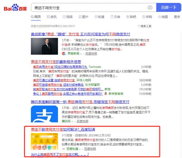 打开百度首页,搜索关键词“美团不用支付宝”,会发现2016、2018年,都出现过用户反映美团点餐曾短暂无法使用支付宝支付的情况,甚至还有如何在美团开启支付宝付款的“攻略”。