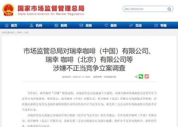 同日,据市场监管总局消息称,今年4月,市场监管总局就瑞幸"自曝"财务造假,迅速成立专案组,对瑞幸咖啡涉嫌虚假交易等不正当竞争行为开展调查。