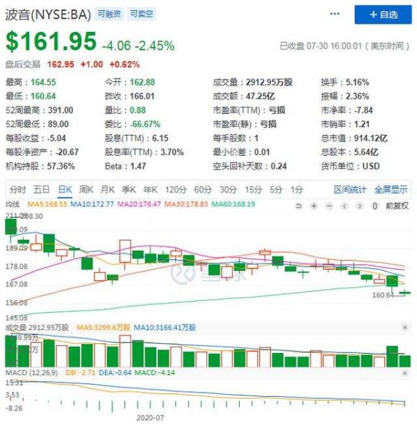 美东时间7月29日盘前,波音公司发布截至2020年6月30日的2020财年二季度财报。从发布的财报数据来看,波音依旧持续亏损趋势,且亏损比例继续呈扩大态势。二季报发布后,周三美股收盘后波音每股166.01美元,跌幅2.83%。截止发稿,每股报161.95美元,总市值914.12亿美元。