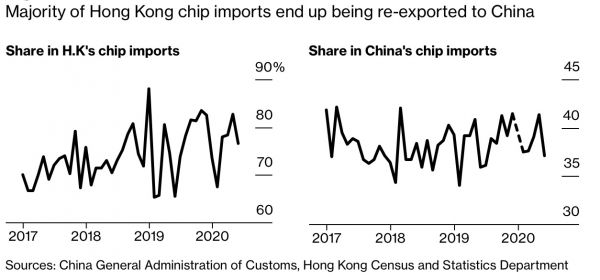 彭博指出,长期以来,香港一直是大陆进口技术的重要管道,部分原因是该地低税率和开放的金融体系,另外一个重要原因是,通过香港公司的海外交易,取得出口许可证的可能性更大。