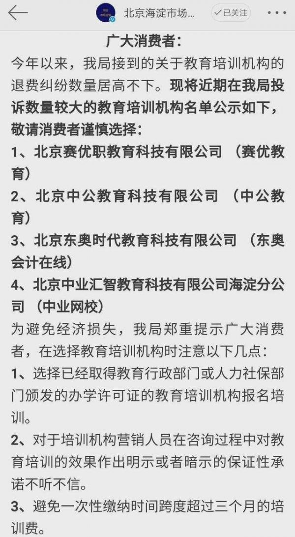 7月14日,北京市海淀区市场监管官方微博发布《海淀区市场监督管理局关于谨慎选择教育培训机构的消费警示》,包含中公教育在内4家教育培训机构近期的投诉数量较大,提醒消费者谨慎选择。