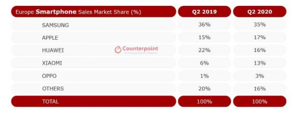 在欧洲市场,华为手机在欧洲市场的空缺被OPPO和小米、苹果填补,高端市场原本属于华为的用户选择了苹果,而小米、vivo、OPPO尚还不足以在高端市场对苹果造成威胁,而三星在全球高端手机市场的影响力也在下滑,并且基本已经离开中国市场。