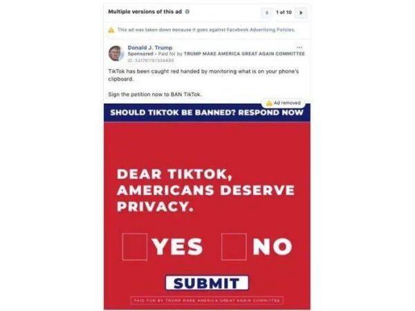 美国大选倒计时的、日历正在变得越来越薄,留给总统候选人的时间也越来越少。为了获取更多的支持,七月中旬,总统候选人特朗普就在 Facebook 和 Ins 上投放了广告,将封禁在美国备受欢迎的中国应用 TikTok(国外版抖音)当作他的政治资本之一。