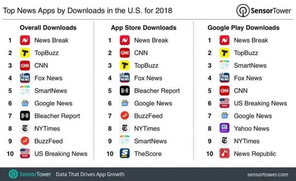 美国 2018 年新闻类应用下载排名,Sensor Tower