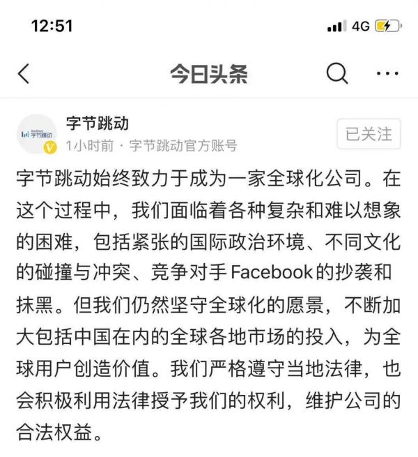 昨日(8月2日)晚间,字节跳动在官方账号罕见对外回应:字节跳动始终致力于成为一家全球化公司。在这个过程中,我们面临着各种复杂和难以想象的困难,包括紧张的国际政治环境、不同文化的碰撞与冲突、竞争对手Facebook的抄袭和抹黑。