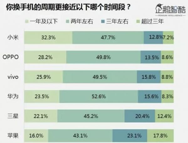 从该表中可以看得,三年以上的手机用户留存率最高的是苹果,达到17.8%,小米手机最低为7.2%。
