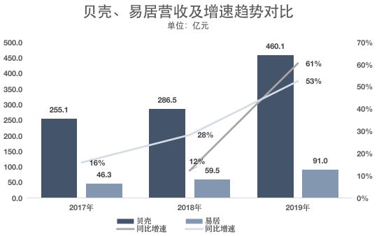 对比来看,贝壳旗下也有三大业务板块,存量房交易服务、新房交易服务和新业务,其中,存量房交易收入在2019年是贝壳的第一大收入来源,占比达53%,但新房业务正在迎头赶上,2019年收入同比增长171%至202.74亿元。