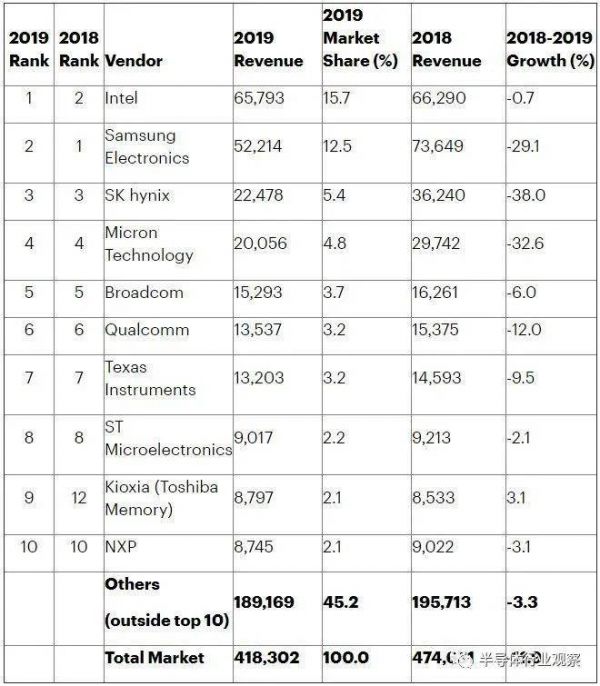 2019年全球半导体厂商销售额排行榜 来源:Gartner