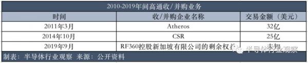 2014年10月,高通花费25亿美元收购了英国芯片厂商CSR公司。收购的回报正如高通当时声明里面提到的,CSR在蓝牙、“蓝牙智能”和音频处理芯片领域拥有技术领导地位,收购CSR稳固了高通的市场地位,扩大了高通物联网芯片业务,包括便携音频设备、车载系统以及穿戴设备。