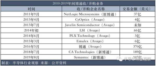 2013到2015年间,对原博通发起收购的Avago分别收购了光学元件公司CyOptics,无线通信企业Javelin Semiconductor,存储领域企业LSI,PLX Technology以及Emulex公司。加强了自身在无线通信领域以及存储领域的实力。